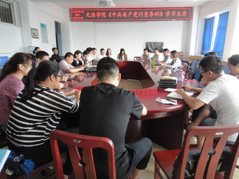 8月29日下午,根据校党委关于“两学一做”学习教育的最新要求,文法学院党总支组织全体党员教师和处级干部在会议室召开会议,集中学习中共中央最新出台的《中国共产党问责条例》(以下简称《问责条例》)。