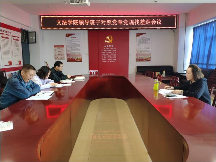 10月23日上午,文法学院在A10—311组织召开“对照党章党规找差距”专题会议,会议由学院党总支书记张琳主持,全体领导班子成员参加会议。