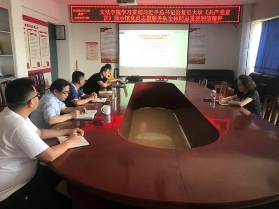 2020年7月20日,文法学院党总支在学院党员活动室学习贯彻了习近平总书记给复旦大学《共产党宣言》展示馆党员志愿服务队全体队员重要回信精神。