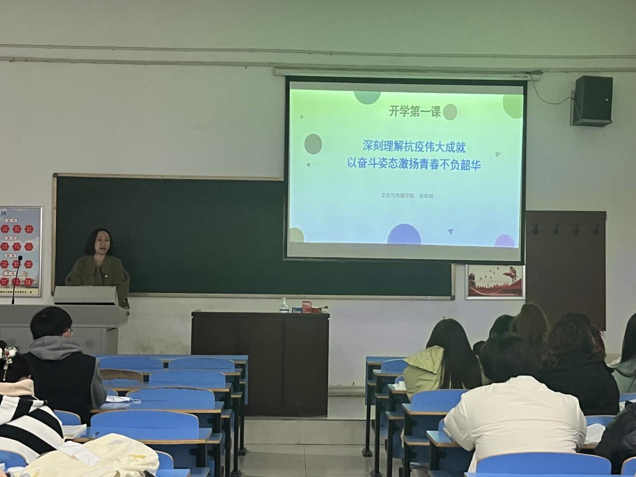 2月24日下午,文化与传媒学院党总支副书记许华珂在A02-103教室为我院2022级学生讲授“开学第一课”,主题为“深刻理解抗疫伟大成就,以奋斗姿态激扬青春不负韶华”。 许书记围绕学习宣传贯彻党的二十大精神为主线,通过讲述青年成长故事,抗击疫情中的先进事迹,引导青年学生“扣好人生第一粒扣子”、思考青春如何作为,动员学生把学习奋斗的具体目标同民族复兴的伟大目标结合起来,把人生抱负落实到脚踏实地的行动中。