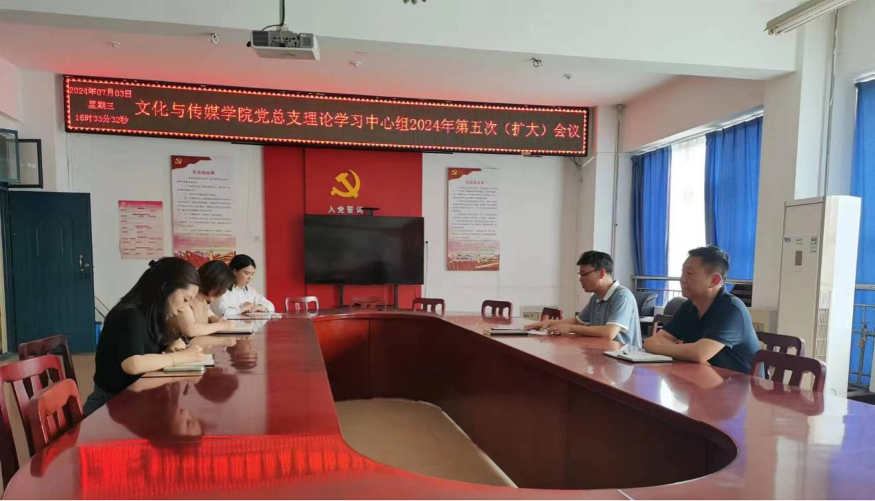 7月3日早上9:30,文化与传媒学院党总支理论学习中心组于A10-311会议室组织开展2024年第五次(扩大)会议。学院党总支书记杨延杰主持会议并讲话,副院长余锐及中心组成员参会。