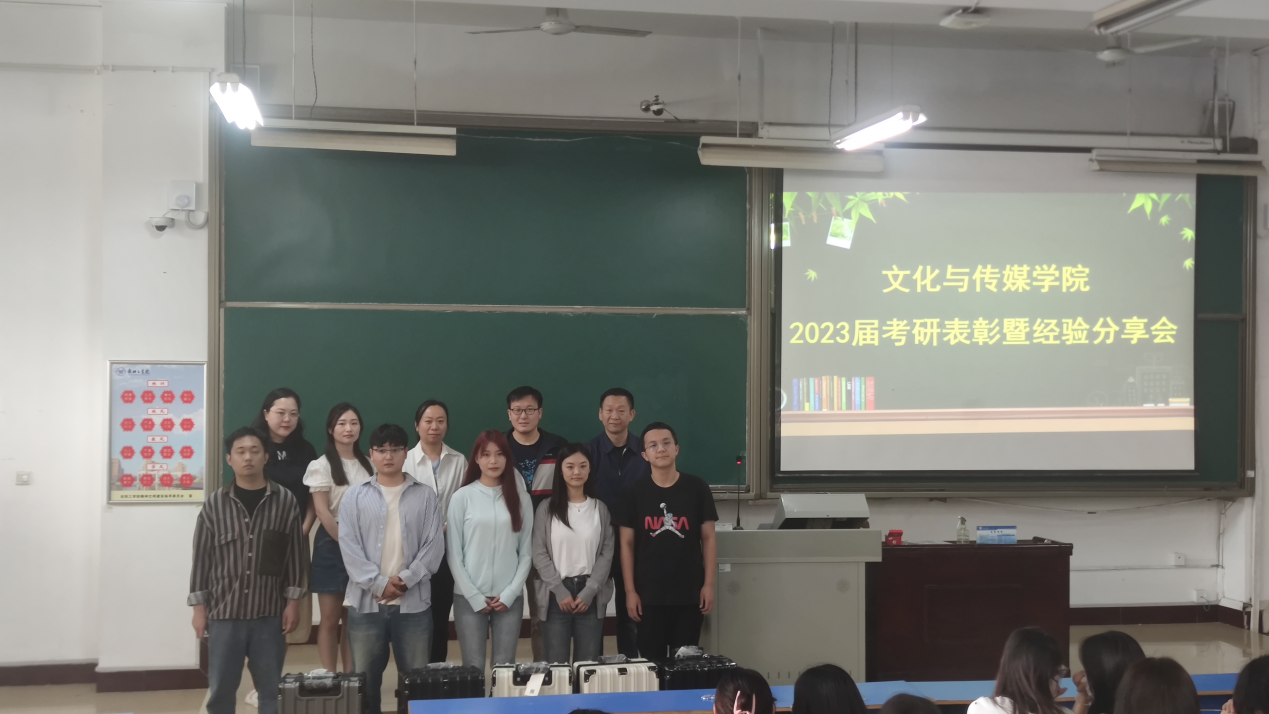 为表彰考研成功的学子,激励备考同学,促进形成良好学风,5月25日下午,文化与传媒学院在A17-102教室召开2023年考研表彰暨经验分享会。文化与传媒学院党总支书记张林、副院长余锐、党总支副书记许华珂出席本次会议,各年级师生代表共一百余人参加。