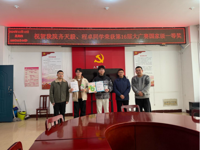 12 月12 日上午,我院在A10-311会议室对在第16 届全国大学生广告艺术大赛中斩获殊荣的学生齐天毅、程卓进行表彰。学院党总支书记杨延杰及辅导员出席表彰活动。二人组成的团队创作的作品《AI 开创 Z 时代节气传承新纪元》荣获“讯飞星火 NEXT 企业特别奖”全国一等奖。这一荣誉不仅赢得了 8000 元企业奖励及欧洲 10 日文化游大奖,更彰显了我院在媒体创意与制作领域的教学成果,突显了我院学子的创新与实践能力。