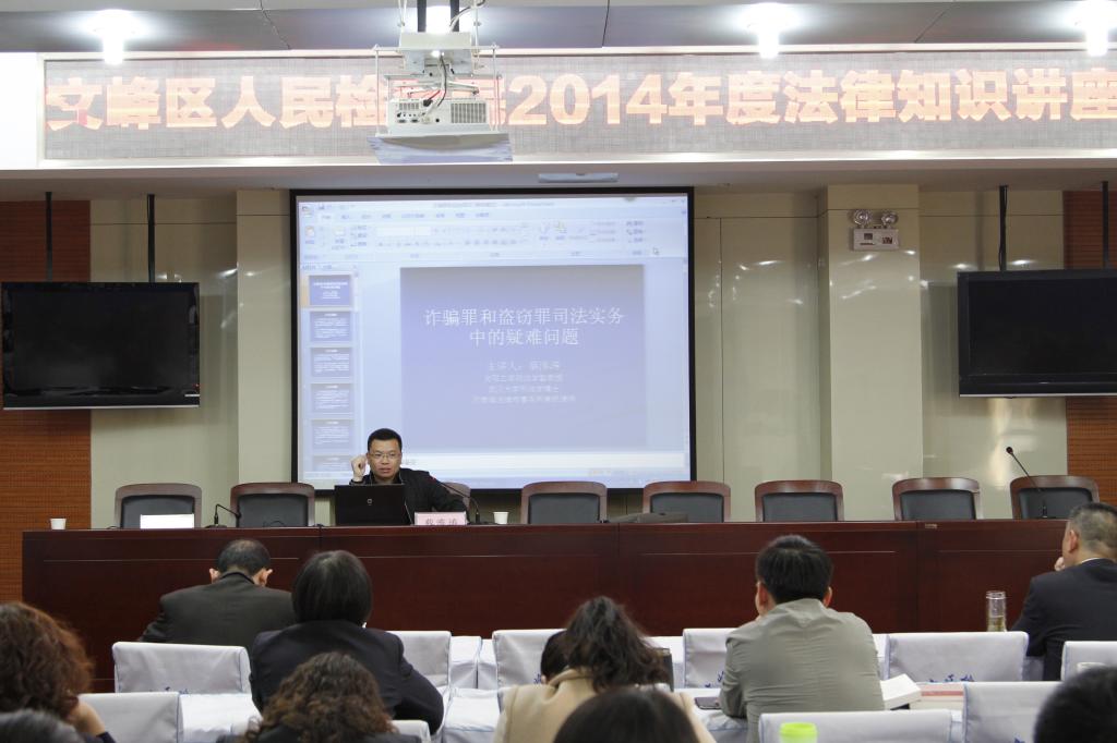 2014年4月3日下午,我院蔡淮涛博士应文峰区检察院的邀请,为该院作了一场题为《诈骗罪与盗窃罪司法实务中的疑难问题》的讲座。讲座历时两个半小时,蔡淮涛老师由实践案例入手,分析了两罪的犯罪构成、在实践中容易混淆的疑难问题及在理论上的争议。讲座结束后,就有关司法实践中的问题进行了学术探讨,为司法实践提供了有力的理论指导。
