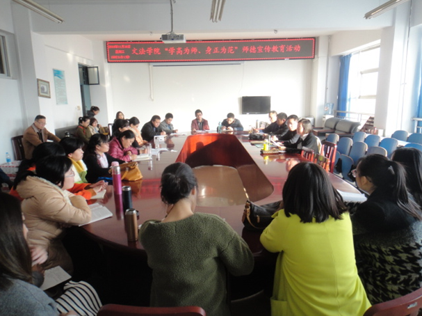 根据校党委的有关要求,为进一步加强师德建设,努力建设一支师德高尚、结构合理、业务精湛、充满活力的高素质教师队伍,文法学院于近日启动了“学高为师,身正为范”师德教育活动。11月30日下午,文法学院召开了“学高为师,身正为范”师德教育活动动员会,全体教师出席会议,文法学院党总支书记张琳主持会议并讲话。