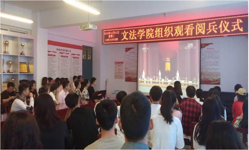 10月1日上午,中华人民共和国成立70周年阅兵仪式在北京举行。文法学院组织党员、团员和学生代表50余人在党员活动室集体观看阅兵仪式直播,此活动作为本学期爱国主义教育的重要一课。学院党总支副书记许华珂老师和辅导员迟源老师参加了本次活动。