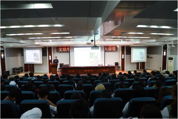 9月27日上午,文法学院举办第十九期《身边的榜样》大讲堂。本期大讲堂邀请了文法学院2016级播音与主持艺术专业王瀚洋同学来做分享。此次活动由文法学院党总支副书记许华珂主持,学院200多名相关专业学生参加了活动。