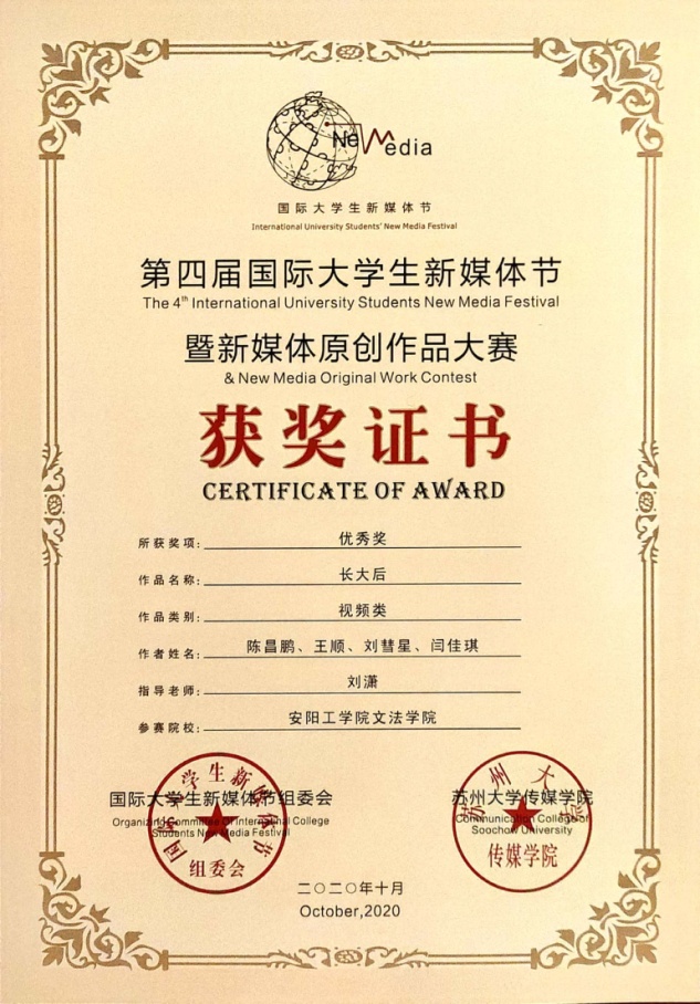 10月25日上午,由江苏省委宣传部、苏州市委宣传部指导,苏州大学主办的第四届国际大学生新媒体节暨新媒体原创作品大赛在苏州正式拉开帷幕。文法学院陈昌鹏、王顺、刘慧星、闫佳琪四名同学的团队作品《长大后》荣获优秀奖。