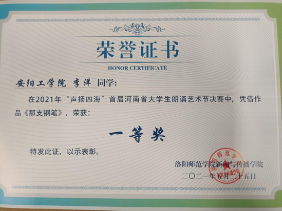 5月21日,首届“声扬四海”河南省大学生朗诵比赛在洛阳师范学院圆满落幕,我校文化与传媒学院播音与主持艺术专业学生李洋在比赛中荣获个人一等奖。
