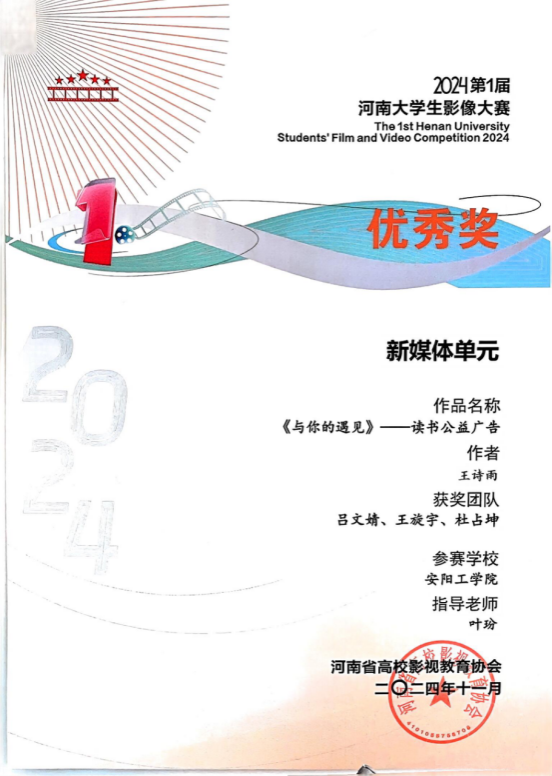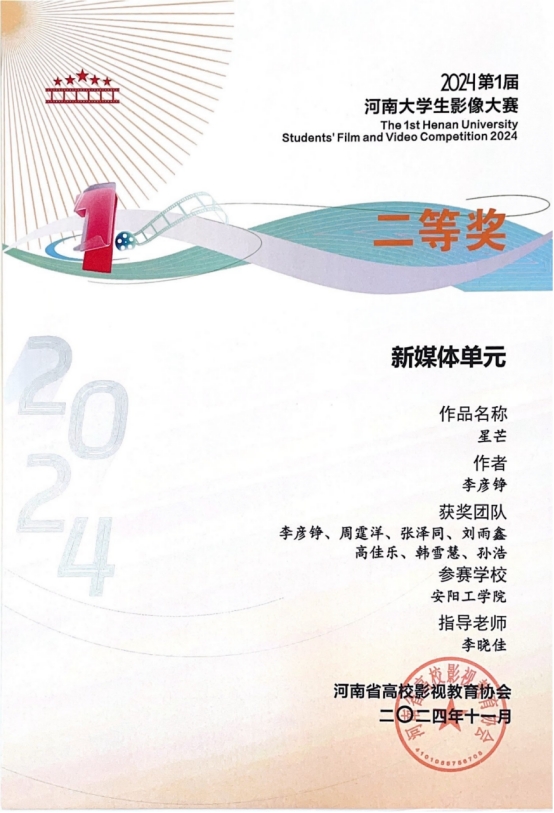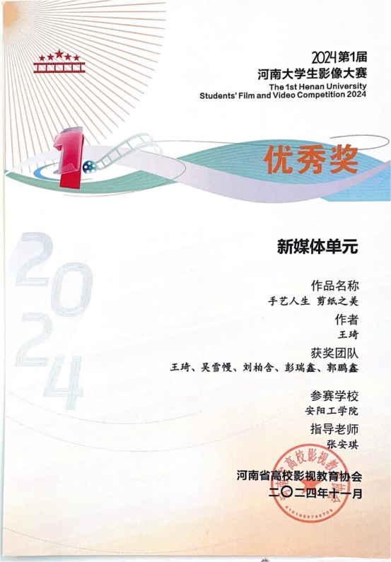 近日,首届河南省大学生影像大赛精彩落幕,我院广播电视编导专业在大赛中获得优异成绩。其中作品《星芒》荣获新媒体单元二等奖,作品《古来稀》获得纪录片单元三等奖,《手艺人生 剪纸之美》和《〈与你的遇见〉—读书公益广告》获得新媒体单元优秀奖。