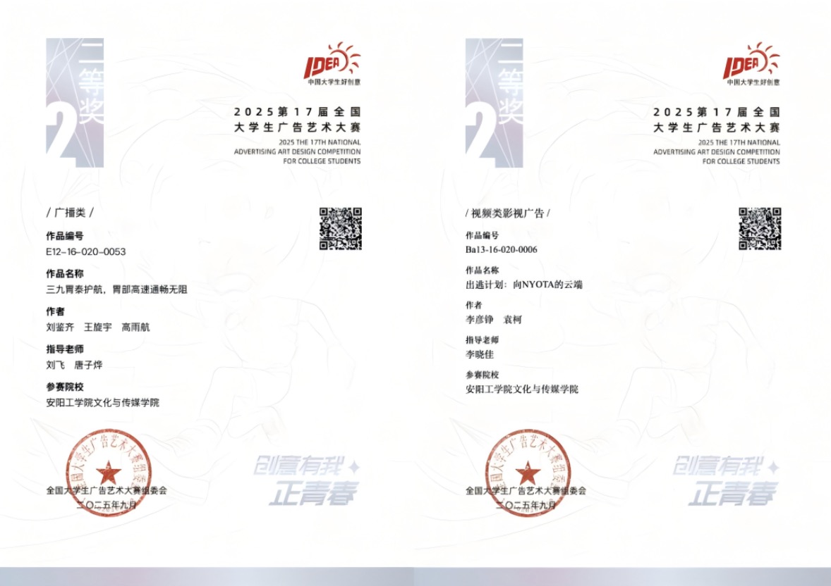 近日,第十七届全国大学生广告艺术大赛结果正式揭晓,yl23411永利集团学生荣获省级以上奖项100项,其中获国家级二等奖2项、国家级三等奖3项、国家级优秀奖4项、省级一等奖13项、省级二等奖40项、省级三等奖38项,燕京等17位老师被评为河南省优秀指导老师。