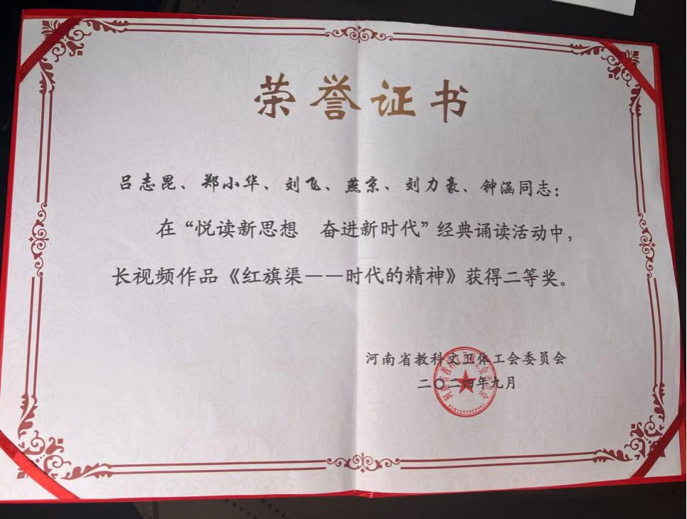 为深入学习贯彻习近平新时代中国特色社会主义思想,深刻领悟党的创新理论的真理力量和实践伟力,持续深化落实省委、省政府关于书香河南建设的重要部署教育引导全省科教文体系统广大职工群众坚定理想信念、提升文化素养,积极投身中国式现代化建设河南实践,很那省科教文卫体工会开展了“悦读新思想 奋进新时代”经典诵读活动。我院播音与主持艺术教研室老师吕志昆、郑小华、刘飞、燕京、刘力豪、钟涵老师积极参与,作品《红旗渠——时代的精神》获得此次诵读活动二等奖。
