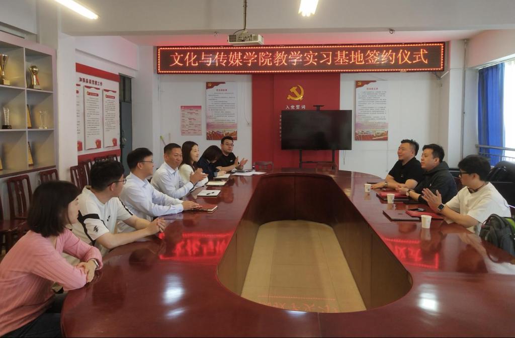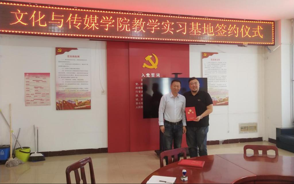 4月23日上午,文化与传媒学院与北京华视百佳文化传媒有限公司于A10-311会议室签订教学实习基地协议,并向林学斯、尹棣、王旋三位代表发放聘任证书。学院党总支书记杨延杰,学院副院长余锐,各教研室主任及实验中心主任参与签约仪式。